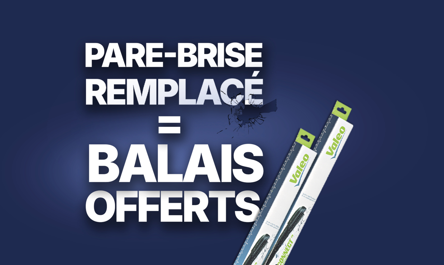 Offre valable du 03 novembre au 31 décembre 2025 exclusivement chez les réparateurs Club Auto Conseil participant pour toute intervention de remplacement de pare-brise, les balais d’essuie-glace avant de marque Valeo Hydroconnect sont offerts (gamme hydroconnect). Offre valable hors pose. Offre réservée aux véhicules légers dont le PTAC est inférieur à 3,5 tonnes. Offre non cumulable avec toute autre offre locale ou nationale en cours sur la même thématique et limitée à une paire de balais par jour et par véhicule, et sous réserve de disponibilité d’une référence de balais compatible avec votre véhicule.